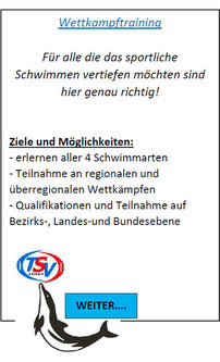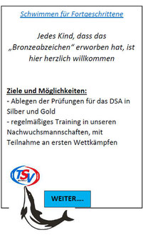 Fortgeschrittene Schwimmer und Schwimmsportbegeisterte haben die Möglichkeit, die DSA in Silber und Gold zu machen oder das Schwimmen beim Training in einer unserer Wettkampfmannschaften zu vertiefen und gemeinsam im Team an verschiedenen regionalen und überregionalen Wettkämpfen teilzunehmen.