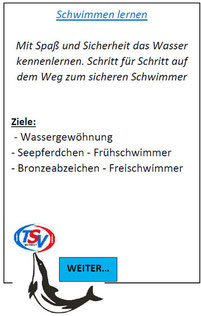 Ab einem Alter von ca. 4,5 Jahren können Kinder in unseren Wassergewöhnungskursen ihre ersten Schwimmversuche machen und mit Spaß und Sicherheit das Wasser kennenlernen. Wir begleiten sie Schritt für Schritt auf dem Weg zum sicheren Schwimmer, über den Seepferdchenkurs (Frühschwimmer) bis zum Deutsches Schwimmabzeichen (DSA) in Bronze (Freischwimmer).