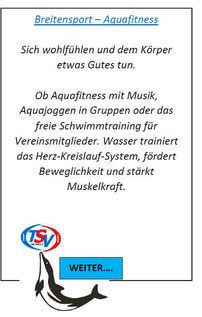 Aber auch Kinder, Jugendliche und Erwachsene, die wöchentlich für ihre Fitness trainieren möchten, ohne an Wettkämpfen teilzunehmen, finden bei uns im Breitensport ein passendes Angebot. Hier gibt es die Möglichkeiten, zum freien Schwimmtraining, zur Teilnahme an unseren Aquafitness- und Aquajoggingkursen und dem sonntäglichen Familienschwimmen für Vereinsmitglieder.